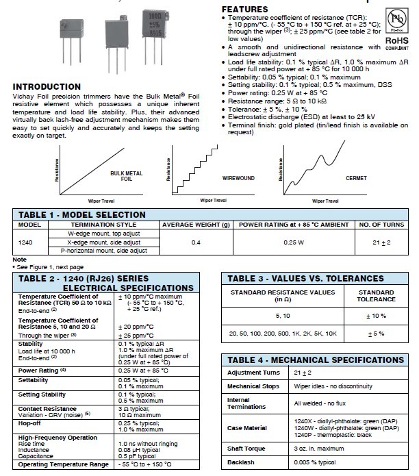 Vishay Foil precision trimmers have the Bulk Metal® Foil resistive element which possesses a unique inherent temperature and load life stability. Plus, their advanced virtually back lash-free adjustment mechanism makes them easy to set quickly and accurately and keeps the setting exactly on target.
