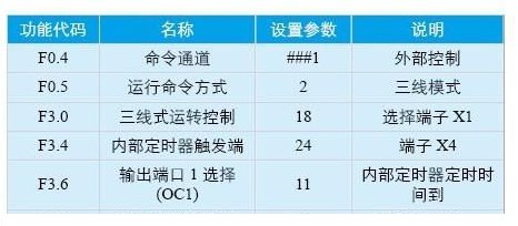 當有紅外傳感器開關輸入信號時端子x1、oc1、cm與fwd組成三線模式,當f6.0設定的內(nèi)部定時器定時時間到時,oc1輸出0.5s的斷開信號, 變頻器停止運行。當有人再次觸發(fā)紅外傳感器開關信號時,變頻器又被啟動。當在設置的時間內(nèi),紅外傳感器開關信號再次被觸發(fā)時,定時器重新計時,保證乘坐扶 梯的人能到達目的地,只到無人時扶梯停止。扶梯從一端到另一端的時間通常為40秒左右,這里我們設定為40秒,此參數(shù)可根據(jù)現(xiàn)場實際情況來設定。