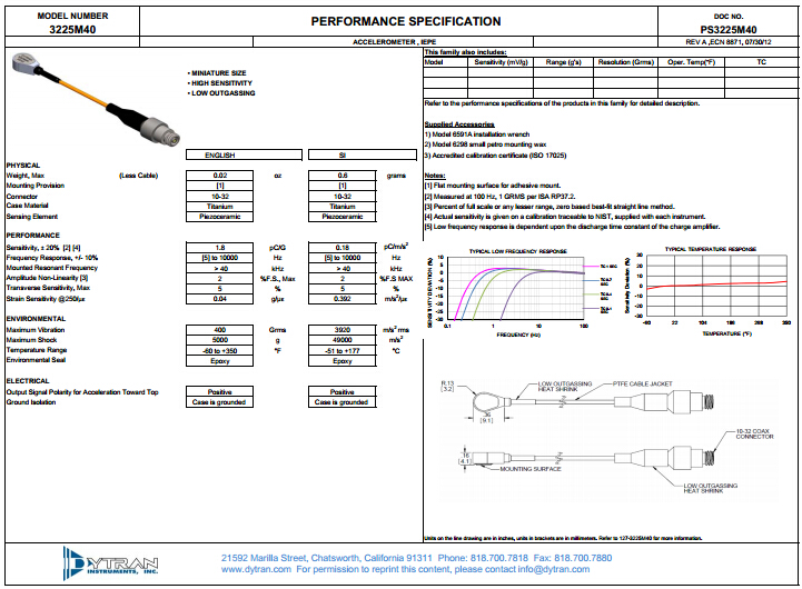 美國(guó)Dytran 3225M40加速度傳感器性能規(guī)格圖:
