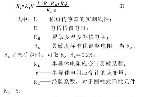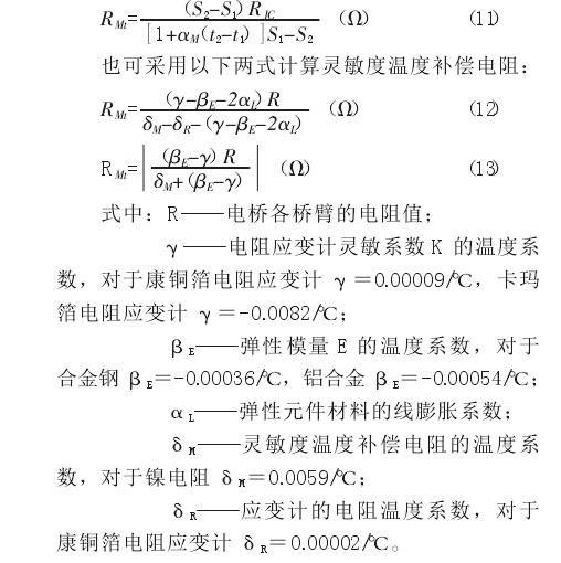 實(shí)踐證明,對(duì)于普通準(zhǔn)確度級(jí)別的稱(chēng)重傳感器,只要彈性元件結(jié)構(gòu)、尺寸、材料、電阻應(yīng)變計(jì)、制造工藝完全一樣,可以采用由抽樣方法經(jīng)過(guò)試驗(yàn)取得靈敏度溫度補(bǔ)償電阻最佳值進(jìn)行補(bǔ)償,而不必逐一反復(fù)測(cè)試調(diào)整。對(duì)于高準(zhǔn)確度稱(chēng)重傳感器和在工作溫度變化大 (例如-15℃~50℃)的環(huán)境下工作的稱(chēng)重傳感器,為了得到較高的補(bǔ)償精度,使其在工作溫度范圍內(nèi)具有較小的靈敏度溫度誤差,必須逐個(gè)進(jìn)行測(cè)試調(diào)整。此時(shí)焊入稱(chēng)重傳感供橋電路的靈敏度溫度補(bǔ)償電阻 RMt應(yīng)比理論計(jì)算值大 10%~15%,為過(guò)補(bǔ)償。然后在其上并聯(lián)一個(gè)高精度、低溫度系數(shù)的金屬膜電阻 RP,來(lái)改善 RMt的非線性,通常稱(chēng)為靈敏度溫度補(bǔ)償?shù)木€性化調(diào)整電阻。進(jìn)行補(bǔ)償時(shí),可用精密電阻箱代替線性化調(diào)整電阻便于精密調(diào)整,待求得最佳調(diào)整電阻值時(shí)再用金屬膜電阻替換。必須強(qiáng)調(diào)指出,補(bǔ)償測(cè)試溫度點(diǎn)至少應(yīng)選取三點(diǎn),即最高工作溫度、最低工作溫度和常溫,而不易只選取常溫和最高工作溫度兩個(gè)點(diǎn),這是因?yàn)殪`敏度溫度補(bǔ)償鎳電阻與溫度不成線性關(guān)系。