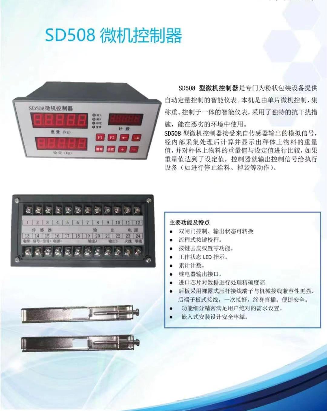 TRf廣州南創(chuàng)電子科技有限公司SD508型微機控制器接受來自傳感器輸出的模擬信號,經(jīng)內(nèi)部采集處理后計算并顯示出秤體上物料的重量值,并對秤體上物料的重量值與設(shè)定值進行比較,如果重量值達到了設(shè)定值,控制器就輸出控制信號給執(zhí)行設(shè)備(如進行停止給料、掉袋等動作)。