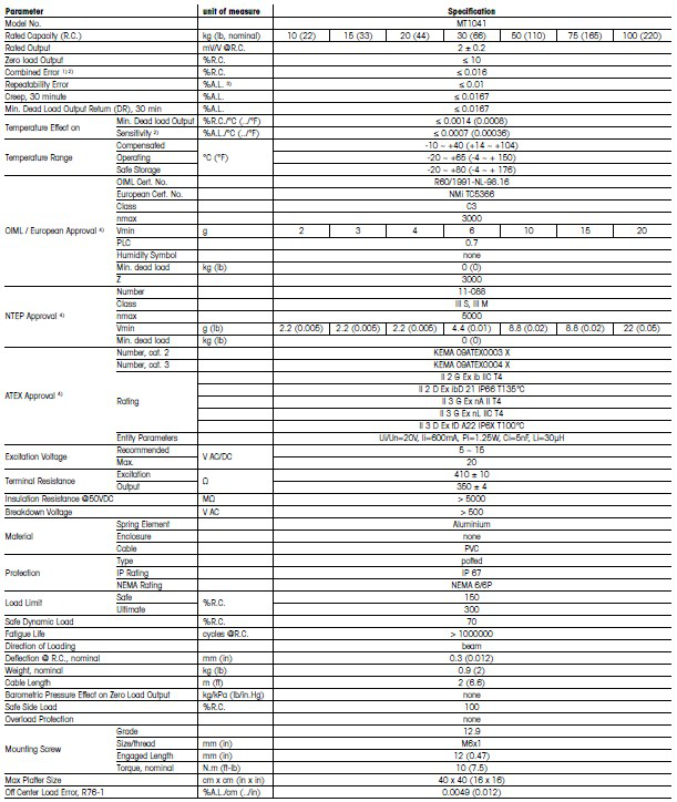 梅特勒托利多MT1041-75稱重傳感器技術(shù)指標(biāo):
