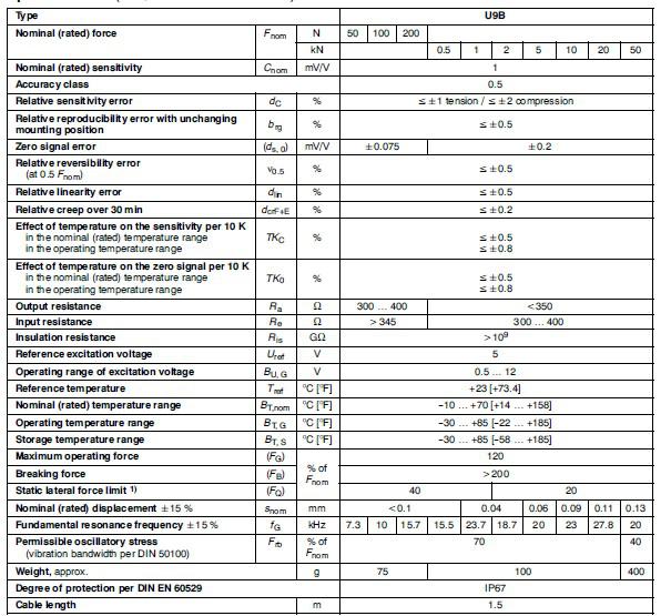 德國HBM 稱重傳感器U9B/20KN技術(shù)指標(biāo):