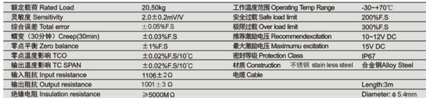 US-50KG稱重傳感器技術(shù)參數(shù):