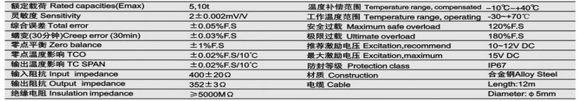 柯力過載限位板環(huán)式BHS-10T拉力稱重傳感器參數(shù):