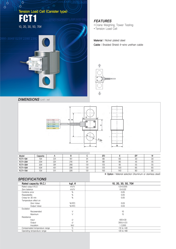 韓國Fine FCT1-10T稱重傳感器參數(shù):