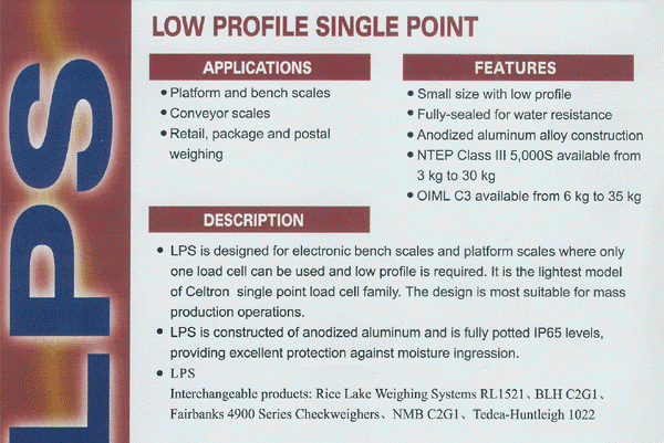 Celtron LPS單點式稱重傳感器應(yīng)用:平臺秤,包裝機(jī),計量/灌裝,皮帶秤/輸送機(jī)秤,運(yùn)作檢查秤,零售秤/計數(shù)秤。