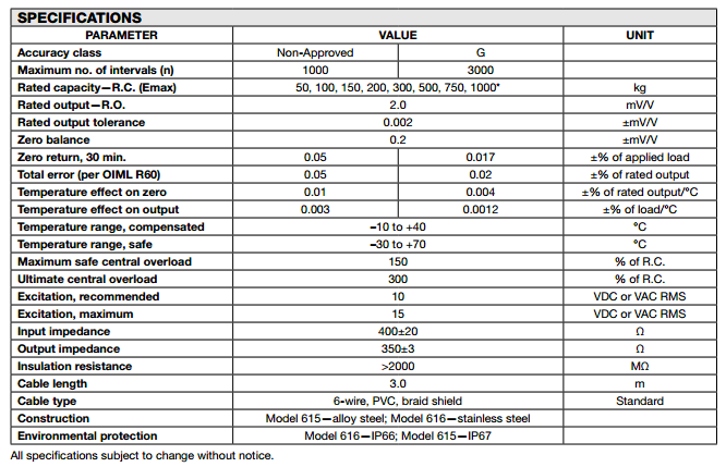 美國(guó)特迪亞Tedea 615稱重傳感器產(chǎn)品參數(shù):GXR廣州南創(chuàng)電子科技有限公司