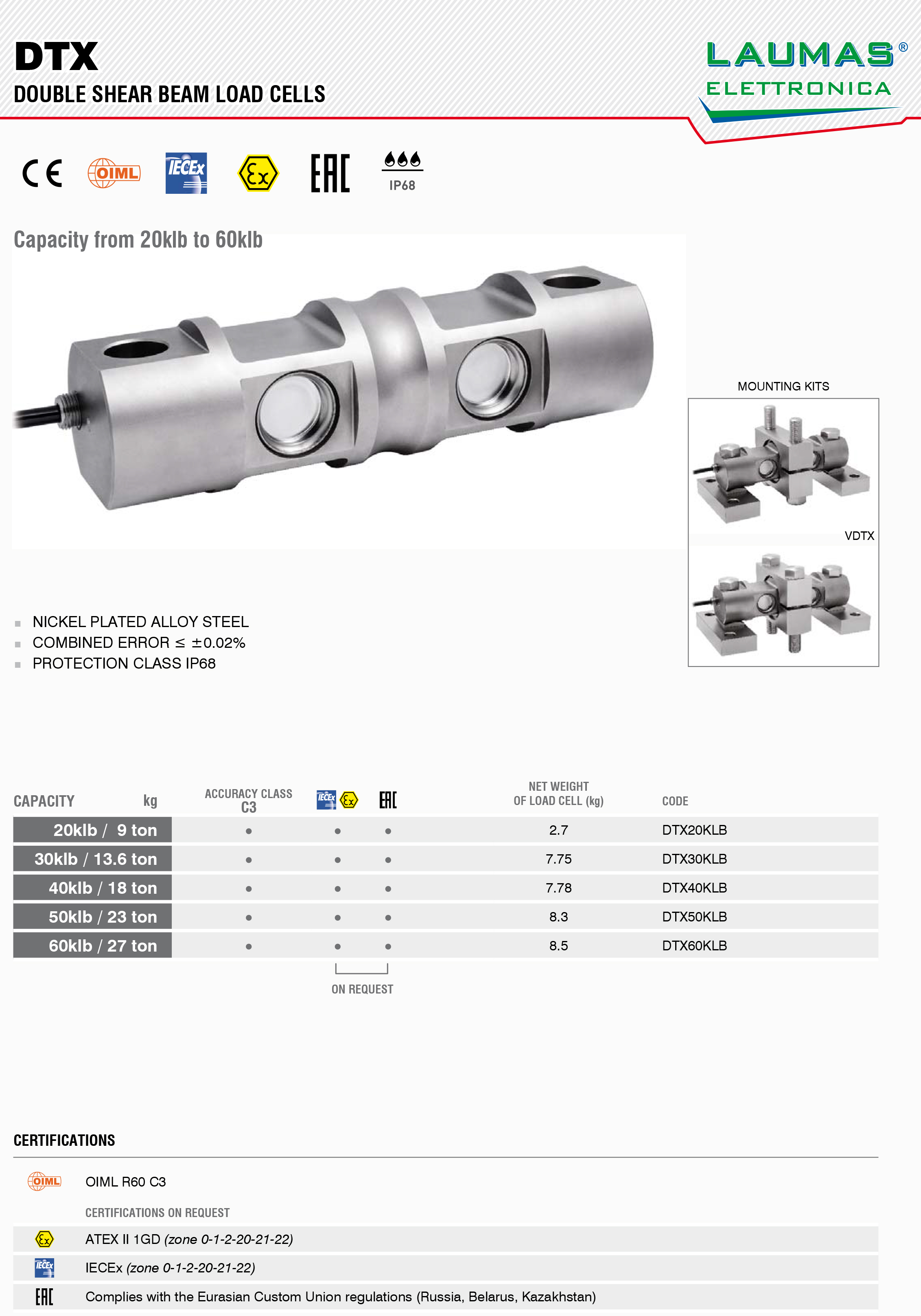 產(chǎn)品名稱(chēng):DTX雙剪梁稱(chēng)重傳感器_DTX-20Kg,DTX-50Kg意大利Laumas
