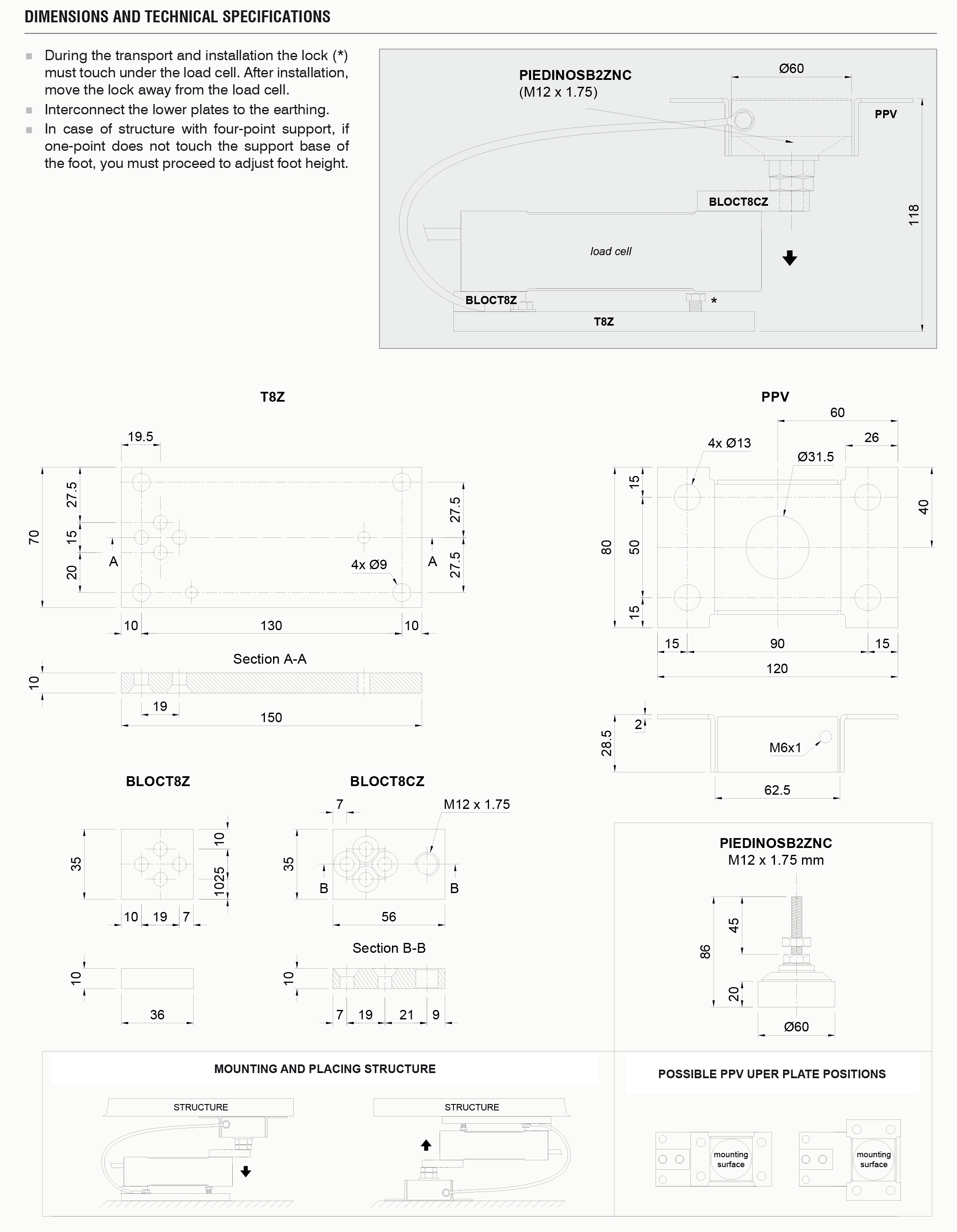 During the transport and installation the lock (*) must touch under the load cell. After installation, move the lock away from the load cell.
