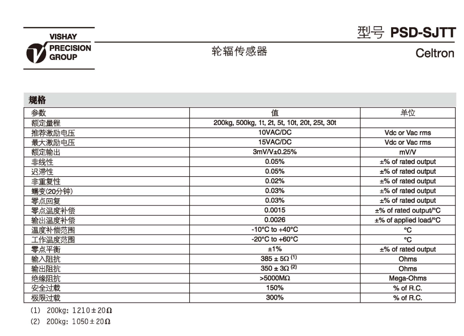 vishay celtron PSD-200kgSJTT稱重傳感器型號類別技術參數選型安裝等資料信息,如果有關