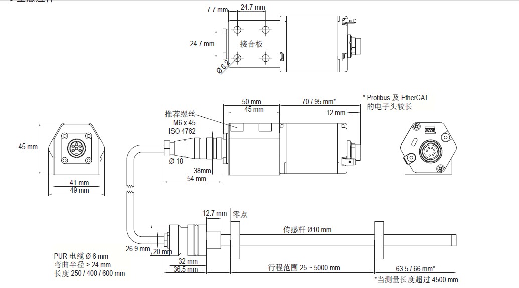 保護(hù) IP65裝有側(cè)面線纜連接部的測(cè)量桿