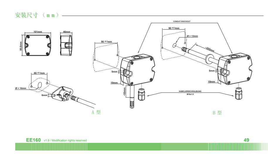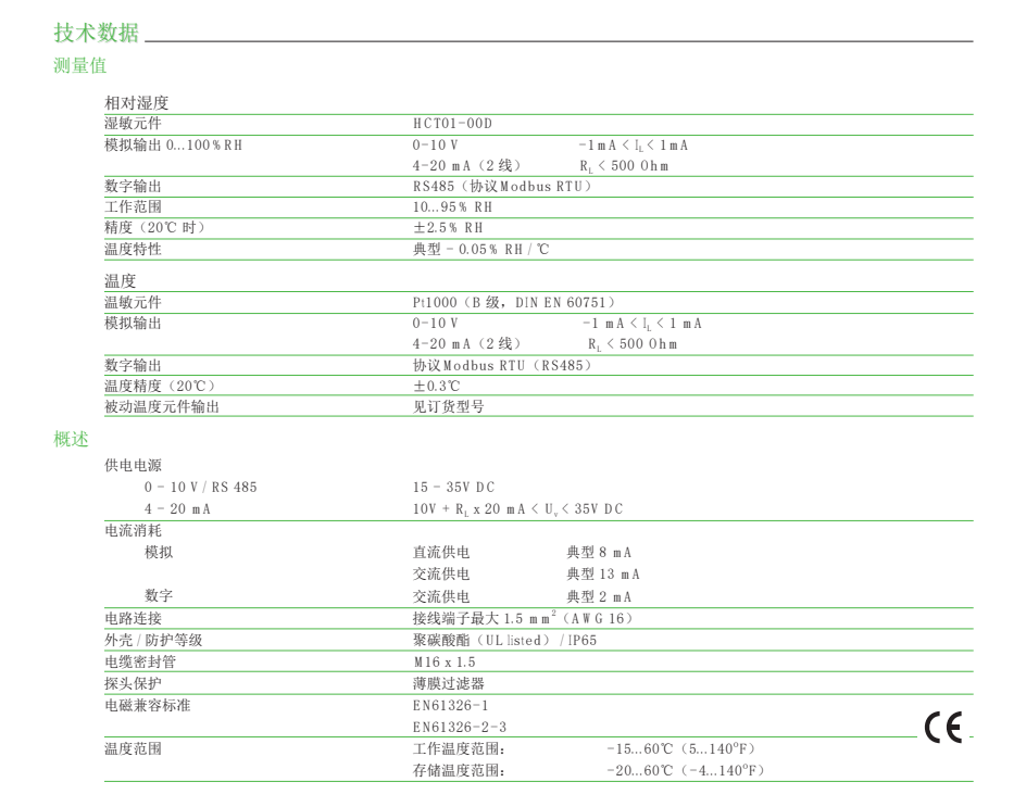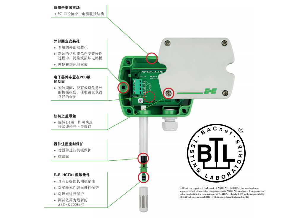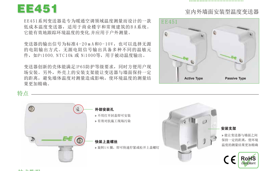 奧地利E+E全系列溫濕度傳感器,ee451系列溫濕度變送器是由奧地利益加義公司專為HVAC系統(tǒng)設(shè)計(jì)開發(fā)的全新系列產(chǎn)品。ee451系列變送器具有高精度、低成本的特性,是測量空氣相對濕度和溫度的理想儀表,能為用戶提供可靠的溫濕度測量解決方案。優(yōu)秀的品質(zhì)及全新設(shè)計(jì)的產(chǎn)品外殼,最大程度地降低了安裝成本,減少了現(xiàn)場的工作量,提升了產(chǎn)品抗污染、抗凝結(jié)的性能,從而保證其在工作過程中將誤差降低到最小程度。ee451系列產(chǎn)品采用了最新的E+E生產(chǎn)的HCT01敏感元件,具備更好的長期 ee451 穩(wěn)定性和抗污能力。結(jié)合了多年的校準(zhǔn)經(jīng)驗(yàn),ee451的測量精度可以達(dá)到±2.5%RH,具有電流(mA)、電壓(V)和數(shù)字通訊三種信號輸出方式。現(xiàn)場安裝分為墻面安裝和風(fēng)管安裝兩種方式。