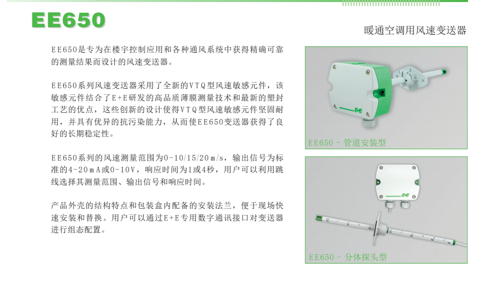 奧地利E+E ee650風(fēng)速傳感器更多產(chǎn)品詳細(xì)資料請點(diǎn)擊:E+E風(fēng)速傳感器,進(jìn)入頁面可查找奧地利E+E風(fēng)速探頭顯示器儀表型號技術(shù)參數(shù)選型資料,以及E+E ee650風(fēng)速變送器具體安裝技術(shù)指導(dǎo)信息。